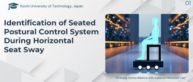 題目は, Identification of seated postural control system during horizontal seat sway(座位の水平揺動中の姿勢制御の同定)というもので,座位で床面を前後方向に水平揺動したときに,臀部下と足下のフォースプレートから得られる力計測値から上半身の重心位置を推定し,その応答に基づいて個人のバランス制御則を同定するという内容です.